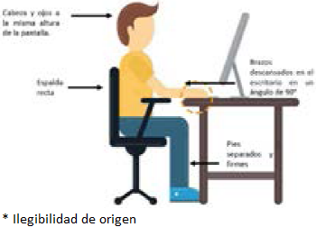 La postura ideal que debe adoptar cada uno de los estudiantes de acuerdo con los lineamientos de la ergonomía digital, es estar sentado con la espalda apoyada al respaldo del asiento, los pies separados y firmes, la cabeza y los ojos tienen que estar a la misma altura de la pantalla o cámara del dispositivo, y los brazos descansados en el escritorio en un ángulo de 90 grados (véase Figura 5).