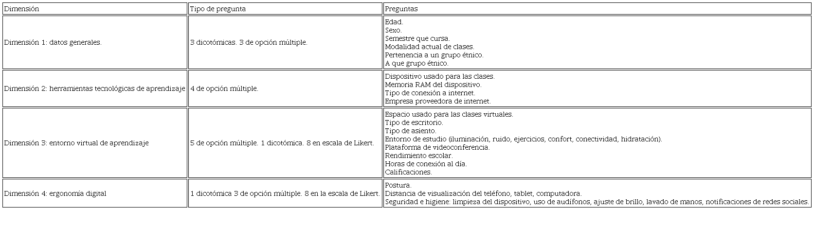 La recolección de datos se realiza mediante un instrumento de medición diseñado y elaborado de acuerdo a las necesidades de esta investigación; fue sometido a un proceso de validación con un grupo de seis expertos en ambientes virtuales de aprendizaje y herramientas digitales que participaron en un grupo focal para la revisión minuciosa de cada ítem. De igual manera, se realizaron las pruebas de confiabilidad en el software de SPSS, para tener de forma objetiva la identificación de características del entorno virtual de aprendizaje y la ergonomía digital en el hogar de los estudiantes.