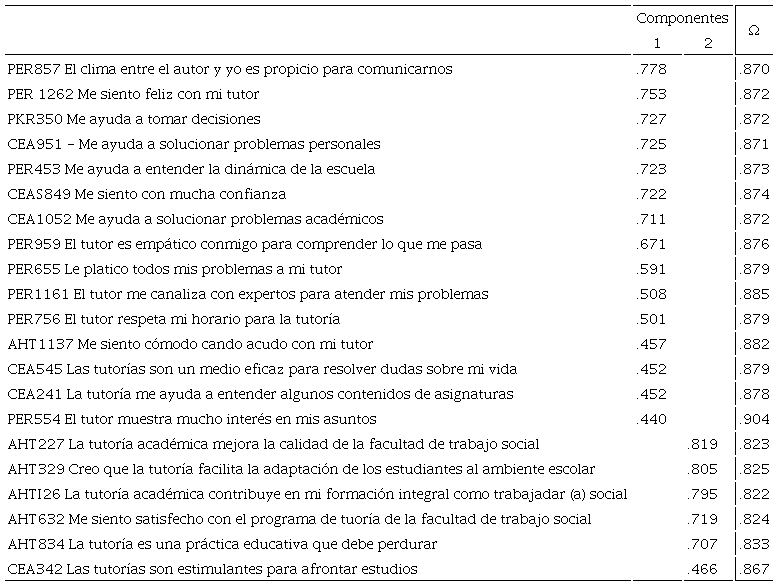En el análisis factorial exploratorio, la reducción de dimensiones con el método de extracción de componentes principales arrojó una solución para dos factores rotados desde el método de varimax. El primer factor, denominado Confianza en la tutoría afectiva y el segundo factor denominado Utilidad en la tutoría académica, obtuvieron niveles de varianza total explicada para una solución de dos factores, de 44.69% para la escala de Confianza en la tutoría afectiva, con un coeficiente de confiabilidad Alpha de Cronbach de .88, con 15 reactivos y, posteriormente, para la escala Utilidad en la tutoría académica, una varianza total explicada para una solución de dos factores, de 59.14%, con un coeficiente de confiabilidad Alpha de Cronbach de .85, con 6 reactivos.