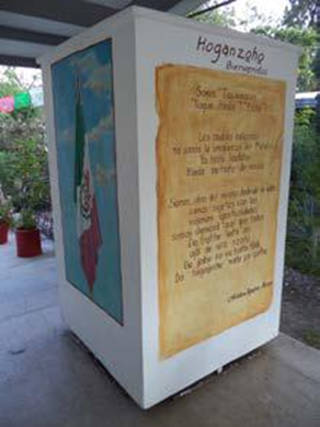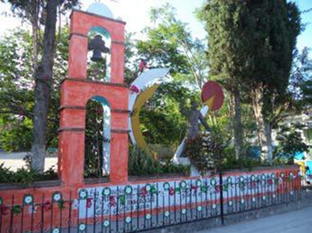 Al acceder a las instalaciones escolares se puede confirmar su pulcritud y buena organización: a la entrada, en línea con diferentes juegos infantiles ubicados entre una cuidada vegetación, pero en un espacio particular y acotado, se levanta un busto de cantera en homenaje permanente a aquel sacerdote (véase Imagen 1). Un poco más adelante, una figura rectangular ofrece en una de sus caras la imagen de una bandera nacional, mientras en otra se da la bienvenida al visitante, en español y en hñahñu (véase Imagen 2);3 a mano derecha se sitúan la dirección escolar y algunos espacios para servicios, dejando lugar para varias aulas, la más cercana de las cuales presenta en su parte posterior un mural que incluye un extenso poema. La mirada pronto es atraída hacia la mitad del patio, en donde se alza una estatua de Miguel Hidalgo, con el prócer enfebrecido llamando a la insurrección (véase Imagen 3).