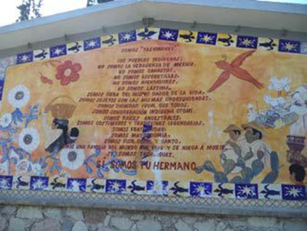 El poema, que es un alegato a favor de las especificidades culturales otomíes, interactúa claramente con la imagen. Esta última, ejecutada por Nahúm Rodríguez Viñez, exalumno del plantel y diseñador gráfico que cuenta con algunas otras obras de promoción a las mayordomías de la congregación (carteles publicitarios de las fiestas religiosas, por ejemplo), esboza la lógica ritual de ofrecimiento de bienes de consumo: a la derecha del mural se presentan como ofrendas los grandes panes cubiertos con papel y con pequeños pájaros de dulce que los mayordomos suelen intercambiar entre sí y para beneficio público en fechas señaladas por el calendario ritual. Este ofrecimiento sugiere y obliga a la reciprocidad en términos de ayuda y trabajo entre donantes y consumidores. La reproducción de una imagen de San Ildefonso, patrono del lugar, la presencia de una madre con su hijo, de los músicos tunditos -que sólo tocan en momentos ceremoniales específicos-, de manufacturas locales como canastas, sahumadores y la floresta elaborada ritualmente con cucharilla silvestre (recolectadas en incursiones específicas hacia cerros circundantes), aluden a formas de organización que tienen la lógica del intercambio como fundamento social.