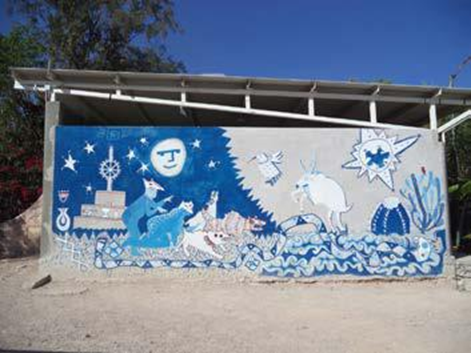 Ya en esa línea, el segundo mural fue resultado de un proyecto sustentado en la idea de educar a través del arte, planteado por la Secretaría de Cultura de la entidad, el Instituto de Arte y Cultura, y las autoridades educativas guanajuatenses (véase Imagen 5). En concordancia con los profesores escolares, el equipo Tráfico Libre de Conocimientos (TLC) impulsó un proyecto de “rescate de tradiciones y costumbres indígenas” denominado B’ede, que en hñäñhu alude a “historia o narración”.11 Encabezado localmente por dos artistas profesionales, el equipo estuvo durante dos ciclos escolares (2015 y 2016) trabajando con los alumnos de la primaria, haciendo recorridos de campo junto con los niños, filmando videos, promoviendo actividades manuales y organizando presentaciones de títeres o mojigangas. Con ellos definieron las imágenes que serían plasmadas en el mural: