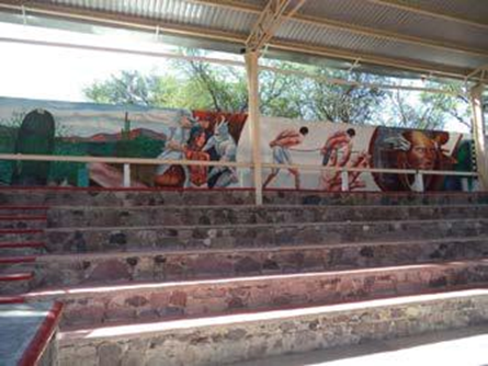 Los murales están marcados por ese tipo de narrativa. Pintados en distintos momentos a partir del año 2001, cuando en el noreste de Guanajuato se impulsaba ya el reconocimiento a los derechos indígenas (Jasso, Vega, 2014), son resultado de la intervención directa de la planta docente y de algunos egresados, así como de la participación de los alumnos de la primaria y de un par de artistas externos asociados con un proyecto educativo institucional de filiación multiculturalista que, como se especificará más delante, involucró a varias instituciones del gobierno de la entidad. El primero de los murales está ubicado en la parte trasera de un aula aunque, como ya se ha señalado, la imagen se ofrece frontal a quien entra a la primaria; el segundo y más experimental se encuentra en la pared perimetral del campo de futbol, y el último tiene como soporte el respaldo de las gradas del salón de usos múltiples.