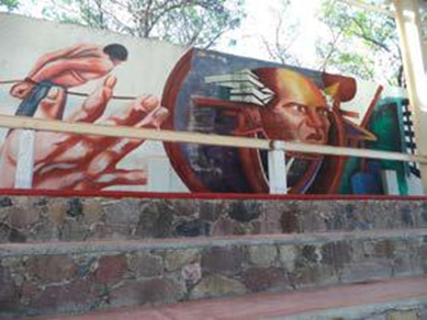 Haciendo a un lado las densas redes de relaciones en donde esta escuela y sus docentes se han desempeñado, y que pueden abordarse simultáneamente como consustanciales a la vida política local y a la aplicación de los programas educativos impulsados por el Estado y el gobierno de la entidad, la escuela resulta representativa en otro sentido: el de su espacialidad física. Con lo anterior refiero menos a su diseño, cuyo modelo predeterminado por el Comité Administrador del Programa Federal de Construcción de Escuelas (CAPFCE) la hizo destacar en un medio rural marcado inicialmente por el uso de materiales autóctonos, y más al uso de sus instalaciones como soporte de símbolos locales. Esto es, con elementos cuyo significado subrayan las características y los posicionamientos tenidos como propios, y que de hecho han funcionado como resortes de la vida política del lugar. Esos contenidos simbólicos se destacan notablemente a través de varias de las expresiones plásticas aludidas brevemente en los párrafos anteriores.