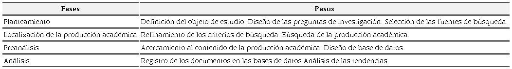 Para el desarrollo de este estudio se tomó como referencia la propuesta diseñada por Navarro-Corona y Ramírez-Montoya (2018), a partir de los planteamientos de Petersen et al. (2008) y Sinoara et al. (2017). El proceso que proponen las autoras consta de cuatro fases: a) planteamiento, b) localización de la producción académica, c) preanálisis, y d) análisis. Los pasos de cada fase se incluyen en la Tabla 1.