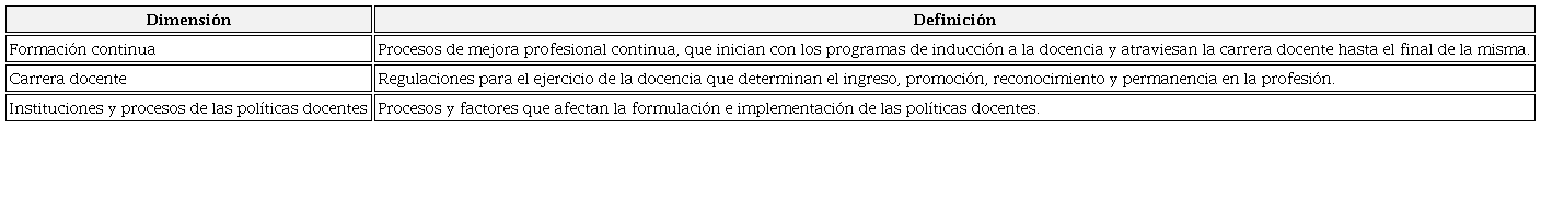 La Oficina Regional de Educación para América Latina y el Caribe de la Organización de las Naciones Unidas para la Educación, la Ciencia y la Cultura (OREALC-UNESCO, 2013), distingue tres dimensiones de las políticas docentes: a) la formación inicial, b) la formación continua y c) la carrera docente.