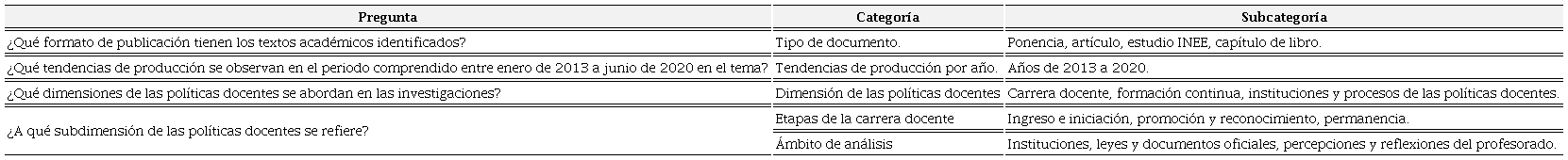 2. Diseño las preguntas de investigación. En la Tabla 3 se exponen las preguntas y categorías de la investigación, que tuvieron como propósito específico caracterizar la producción académica respecto a las políticas docentes en las tres dimensiones antes mencionadas.