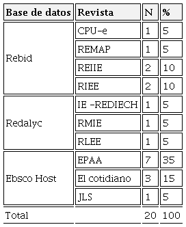 Artículos. Se identificaron en las bases de datos Rebid, Redalyc y Ebsco Host diez revistas con textos pertinentes para este estudio, de las cuales siete son nacionales: Revista de Investigación Educativa (CPU-e), Revista Mexicana de Análisis Político y Administración Pública (REMAP), Revista Electrónica de Investigación e Innovación Educativa (REIIE), Revista de Investigación Educativa de la Red de Investigadores Educativos de Chihuahua (IE-REDIECH), Revista Mexicana de Investigación Educativa (RMIE), Revista Latinoamericana de Estudios Educativos (RLEE), El Cotidiano - Revista de la Realidad Mexicana Actual; dos de Estados Unidos: Journal of Labor and Society (JLS) y Education Policy Analysis Archives (EPAA); y una española: Revista Iberoamericana de Evaluación Educativa (RIEE). En la Tabla 4 se precisa el número de artículos encontrados en cada revista.