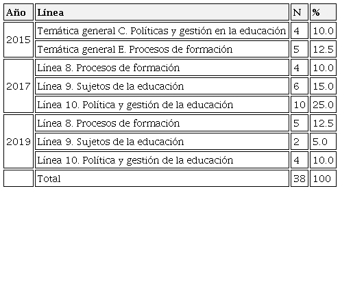Ponencias. Las memorias de los congresos del COMIE se dividieron por líneas de investigación. En este estudio sólo se revisaron las que se consideró tenían relación con el tema de políticas docentes. En los archivos del Congreso 2015 se revisaron las temáticas c) Políticas y gestión en la educación y e) Procesos de formación. En las memorias de 2017 y 2019 se analizaron las áreas temáticas 8) Procesos de formación, 9) Sujetos de la educación y 10) Política y gestión de la educación. En total se descargaron 40 textos.