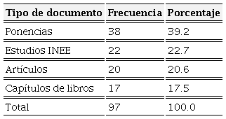 Estudios del INEE. En el buscador del repositorio del INEE no es posible realizar búsquedas por tipo de publicación, por lo que para identificar los textos pertinentes se ingresó a la colección “Estudios e Investigaciones” y se realizó la lectura de los títulos de los documentos.