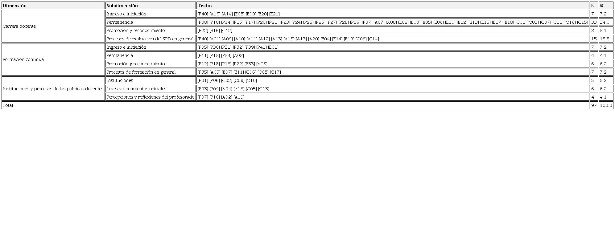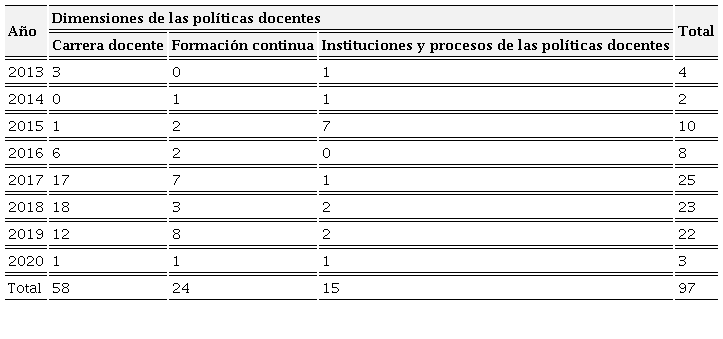 En cuanto al análisis de las dimensiones, carrera docente fue el tema más estudiado y, dentro de éste, la evaluación del desempeño con fines de permanencia, seguida de los procesos de evaluación en general. En la dimensión formación continua, las subdimensiones más estudiadas fueron ingreso e iniciación y procesos de formación en general. En contraste, la formación continua en los procesos de permanencia fue el tema menos analizado. En instituciones y procesos de las políticas docentes los estudios se desarrollaron en el siguiente orden: leyes y documentos oficiales, instituciones, y percepciones y reflexiones, no hubo una diferencia sobresaliente entre el número de textos en cada subdimensión.