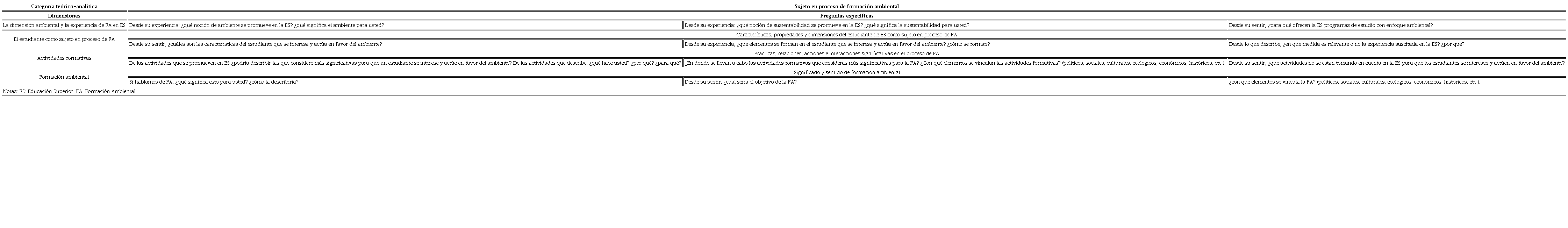 El campo de conocimiento en donde se ubica el artículo corresponde al de la investigación en educación ambiental para la sustentabilidad, donde se observa una marcada ausencia respecto a la constitución teórica de la FA, lo cual se piensa que repercute de manera directa sobre la puesta en práctica de estrategias y procesos para dicha formación. Considerando el vacío en la literatura especializada respecto a la identidad teórica de la FA, el presente artículo propone la categoría teórico-analítica Sujeto en proceso de FA para elucidar su identidad teórica y contribuir con su construcción como proceso en sí mismo. Para operacionalizar dicha categoría se perfilaron dimensiones susceptibles a explorarse en la realidad empírica, a través de la aplicación de una entrevista semiestructurada (véase Tabla 1), en cuyo diseño se cuidó que las preguntas fueran suficientemente flexibles para que posibilitaran la manifestación de la realidad y la descripción de las dimensiones en términos de sus propiedades.