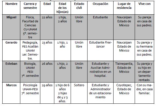 Todos ellos fueron padres mientras continuaban estudiando: Gerardo, en primer semestre, Miguel y Marcos en el quinto, y Esteban en sexto semestre. Todos se establecen como pareja en unión libre a partir del embarazo. Miguel, en particular, cohabita con su pareja hasta después del nacimiento de su hija. A continuación se muestran brevemente las características particulares de cada uno de ellos: