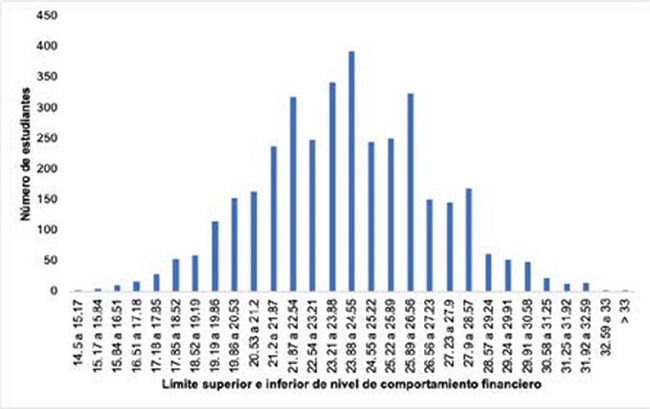 Asimismo, en la Figura 1, Tendencia del Modelo, los indicadores poseen una tendencia de distribución normal, por lo que su dispersión es baja; en el eje horizontal se pondera el nivel de comportamiento financiero obtenido por cada estudiante de las instituciones de educación superior; en el eje vertical se grafica el número de estudiantes que poseen el nivel establecido en los límites superior e inferior. Cabe destacar que la escala total oscila entre 14.5 y 34.6; entonces, se concluye que las variables están altamente correlacionadas, es decir, que se afectan entre sí.