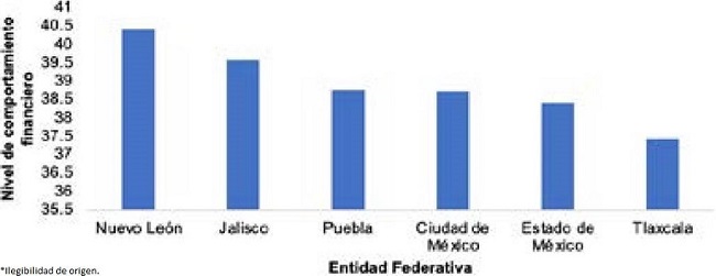 Por ello, se observa que el comportamiento financiero es aún inadecuado ya que en promedio las entidades federativas obtuvieron un puntaje de 38.89 de los 57.50 puntos que podían alcanzar como máximo, es decir, una evaluación menor al límite superior establecido en 18.61 puntos. Estos resultados evidencian que en su futuro próximo estos jóvenes no tendrán las herramientas necesarias para llevar sus finanzas personales de manera adecuada; de la misma manera que Kirkcaldy et al. (1993) mencionan que las actitudes de las personas hacia el dinero se aprenden desde temprana edad y estas mismas se mantienen en la vida adulta.
