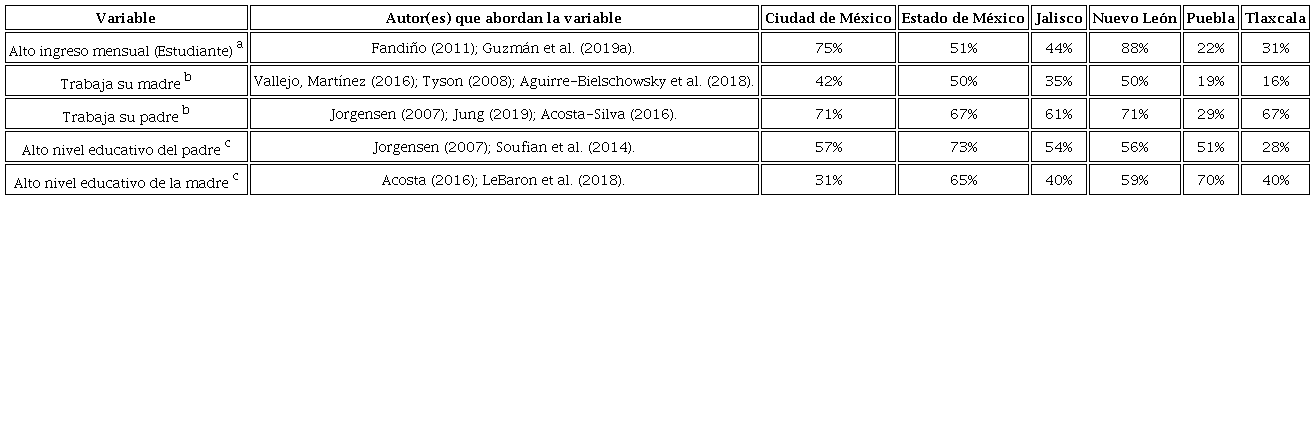 Se muestra que los universitarios poseen ingresos favorables en los seis estados de la república mexicana, lo cual está relacionado con el hecho de que sus padres trabajen ya que, en la mayoría de los casos, el porcentaje de ocupación supera 50%. En Puebla, el empleo promedio de los padres oscila entre 29% y 19%, lo cual incide a su vez en el ingreso mensual del estudiante, puesto que este representa el tanto por ciento más bajo de las entidades, es decir 22%.