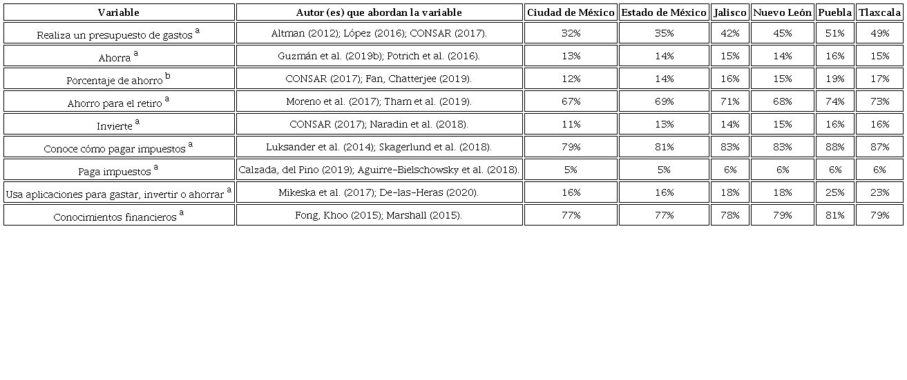 Las variables FPsic, FSce y EduF, tienen la característica de ser latentes, es decir, que fueron conformadas por ítems de apoyo. El modelo utilizó 20 variables en total para medir su incidencia en el comportamiento financiero de los alumnos. A continuación, se presenta un desglose de ellas y su representatividad en cada entidad federativa.