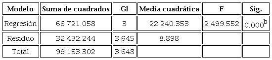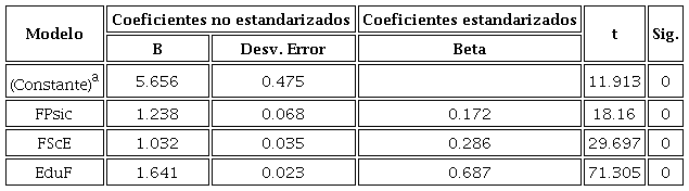 Se propuso un modelo de regresión multivariada en el que se realizaron pruebas de varianza (ANOVA) de las variables explicativas (EduF, FPsic, FSce), para cuantificar la implicación de éstas con la variable dependiente (Tabla 4), es decir, el comportamiento financiero.