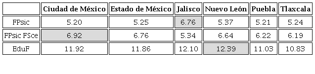 Tras la construcción y análisis de coeficientes, se puede obtener una ponderación de las variables FPsic, FSce y EduF, por entidad federativa. A continuación, se presentan los resultados obtenidos, para conocer la incidencia de éstas en la población estudiantil (Tabla 6).