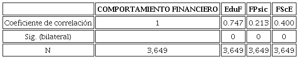 Con los datos de la tabla anterior se muestra que la correlación entre el comportamiento financiero y la educación financiera poseen el valor más alto (0.747); en contraparte, los factores psicológicos poseen menor asociación a la variable dependiente. Hallazgo que coincide con Osorno et al. (2021), quien señala que la variable con mayor influencia es el nivel de educación financiera; no obstante, mientras que el nivel socioeconómico es el componente menos relevante para el estudio realizado por el autor, nosotros encontramos los factores psicológicos como la variable menos decisiva. En consecuencia, se cumple la hipótesis del alto impacto que representa la variable educación financiera en la construcción del comportamiento financiero.