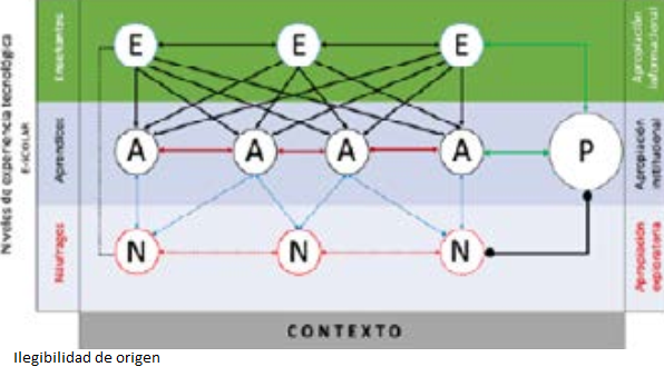 El holograma escolar dibuja un marco de relaciones diversas donde la apropiación es un punto nodal atravesado por un sistema de relaciones, interacciones, experiencias, saberes, políticas, pero ante todo, de sujetos que cargan con condiciones particulares. En ese ecosistema tecno-educativo (Figuras 4 y 5), se dibuja un mapa de interacciones sociales que emergen en el espacio social educativo, una abstracción de concurrencias comunicativas sobre las que ocurre y concurre la apropiación tecnológica, devenida de las revisiones que le dan forma al estudio.