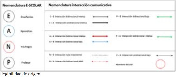 El sistema tecno-educativo produce nueve interacciones comunicativas binomiales, las cuales se entienden como las relaciones que se detonan entre los actores escolares a través del intercambio de experiencias tecnológicas, donde la intensidad de las relaciones está motivada por el interés de los sujetos como una puesta en común. Éstas se explican a continuación: