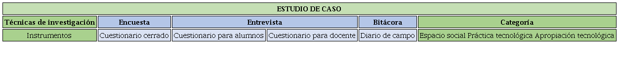 Las correlaciones de una perspectiva teórico-metodológica van de la mano con una propuesta de instrumentos que perfilen los objetivos planteados. El diseño de este estudio se sostiene en técnicas (encuestas, entrevista y bitácora) e instrumentos (cuestionario cerrado, cuestionario para docente y alumnos, y diario de campo) que dibujan el mapa del estudio de la investigación. El diseño se explicita en el Cuadro 1.