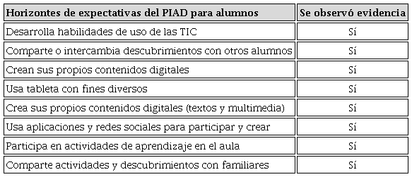 En contraste a lo anterior, en este tipo de apropiación hay otras singularidades de la práctica señaladas por la institución. Aquí pueden verse alumnos con habilidades destacadas que cumplen con los actos que señala la institución. Acorde a la práctica mostrada en el espacio áulico,3 se visibilizan conocimientos donde el niño realiza operaciones y acciones clave, como habilidades operativas, competencias comunicativas, lenguaje de aprendizajes independientes y trabajo en equipo, mismas que responden en mucho a las prácticas esperadas por el PIAD.