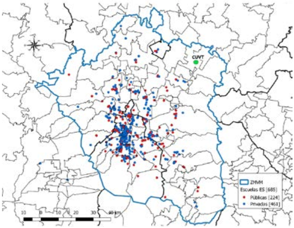 El análisis de la movilidad social intergeneracional de las y los egresados del CUVT tuvo tres fases. En la primera se hizo un acercamiento a nivel meso del espacio percibido, para analizar la desconcentración de la oferta de educación superior en la región de la ZMVM. Este primer acercamiento fue necesario dado que el CUVT forma parte de esta área metropolitana y su ubicación en la periferia le concede su carácter periurbano. Este acercamiento se realizó a través del uso de información estadística obtenida del Sistema Nacional de Información de Escuelas (SNIE) de la SEP y datos sociodemográficos obtenidos del Instituto Nacional de Estadística y Geografía (INEGI) y el Consejo Nacional de Población (CONAPO). El procesamiento de esta información se hizo con el uso del Quantum Geographic Information System (Q-GIS). Este software es un sistema de información geográfica (SIG).