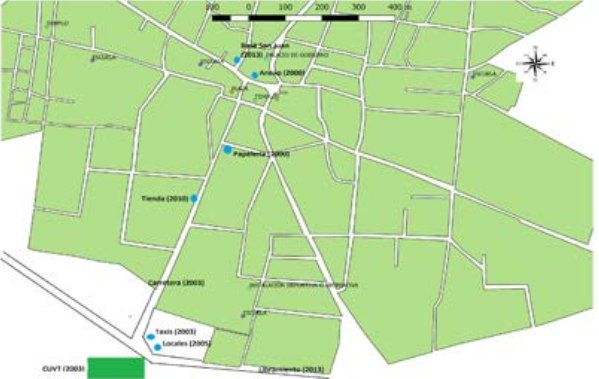 En este mapa, los círculos azules indican los cambios en el espacio del pueblo, así como los años en los que ocurrieron. Los primeros acercamientos ofrecen una visión del espacio donde se ubica el caso de estudio desde la perspectiva de la producción social del espacio, lo percibido (el contexto material) y lo concebido, las ideas y objetivos con que se creó el CUVT. Estos panoramas también ofrecen una primera mirada al espacio vivido, a la manera como las personas se apropian del espacio y lo modifican.