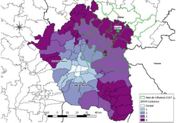 Un elemento clave para la representación de los cambios en la movilidad espacial de las y los participantes fue un mapa compuesto por tres capas de información. Dado que el CUVT se ubica en la ZMVM, una primera capa muestra el área que abarca esta zona. La segunda capa recupera el esquema de contornos, desarrollado por Aguilar y López (2014), los cuales fueron construidos a partir de la incorporación cronológica de municipios a la ZMVM y esbozan la expansión de la metrópoli a través de franjas o anillos en torno a un área central. Y la tercera capa muestra el área de influencia del CUVT. El mapa con la integración de las tres capas se muestra a continuación.