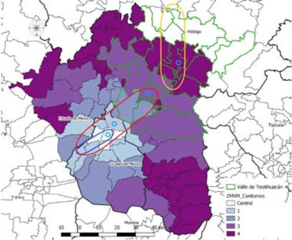 Autores como Aguilar y López (2014) identifican diferentes contornos conformados por los municipios que se han integrado a la ZMVM durante el proceso de expansión física. En las áreas periféricas alejadas del centro, los nuevos desarrollos inmobiliarios contribuyeron al crecimiento de la superficie y de la población. Estas áreas coexisten con desarrollos para las clases medias y con amplios sectores de población trabajadora que se han reubicado siguiendo la oferta formal de vivienda accesible de acuerdo con sus ingresos, y que resulta poco atractiva para los trabajadores más jóvenes. La relocalización poblacional incrementó los tiempos de traslado entre las áreas habitacionales y las de empleo (Almejo, Téllez, 2015).