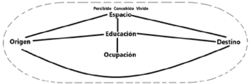 Siguiendo la propuesta de la geografía de la educación (Taylor, 2009) y de los acercamientos geoespaciales (Hillman, 2017), de recuperar las ideas de espacio y lugar para el análisis de los fenómenos educativos, este modelo conserva del triángulo OED sus elementos base, pero agrega la ocupación como elemento que también es afectado por el origen, que se relaciona con la educación, y de forma independiente o combinada con la educación media, el con destino. Al modelo del triángulo OED se agrega el espacio ―y el movimiento en él― que tiene un papel central en el análisis de la movilidad social, pues el origen socioeconómico es un lugar en el espacio, así como el destino y los sitios donde se da el proceso de movilidad social. El espacio en el modelo no refiere sólo al espacio geográfico, integra las tres dimensiones propuestas por Lefebvre (1974): percibido, concebido y vivido. Finalmente, la elipse punteada señala el carácter dinámico de los procesos de movilidad social y espacial pues, como indica Soja (2010), las personas son seres espaciales y temporales.