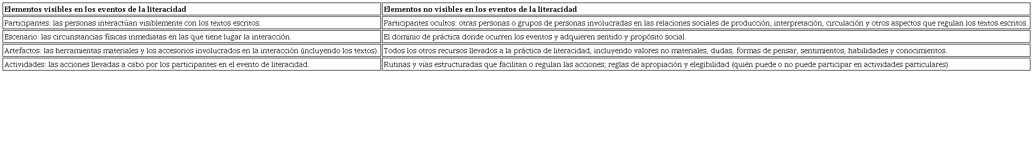 Hamilton (2000: 18) identificó cuatro puntos para el análisis de los eventos letrados: los participantes, el escenario, los artefactos y las actividades (véase la Tabla 1). La autora asevera que las “prácticas letradas sólo pueden ser inferidas a partir de evidencia observable porque incluyen recursos invisibles, como el conocimiento y los sentimientos; que encarnan propósitos sociales y valores; y son parte de un contexto en constante cambio, tanto espacial como temporal”. También expresa que los eventos pueden leerse en relación con el contexto sociocultural.