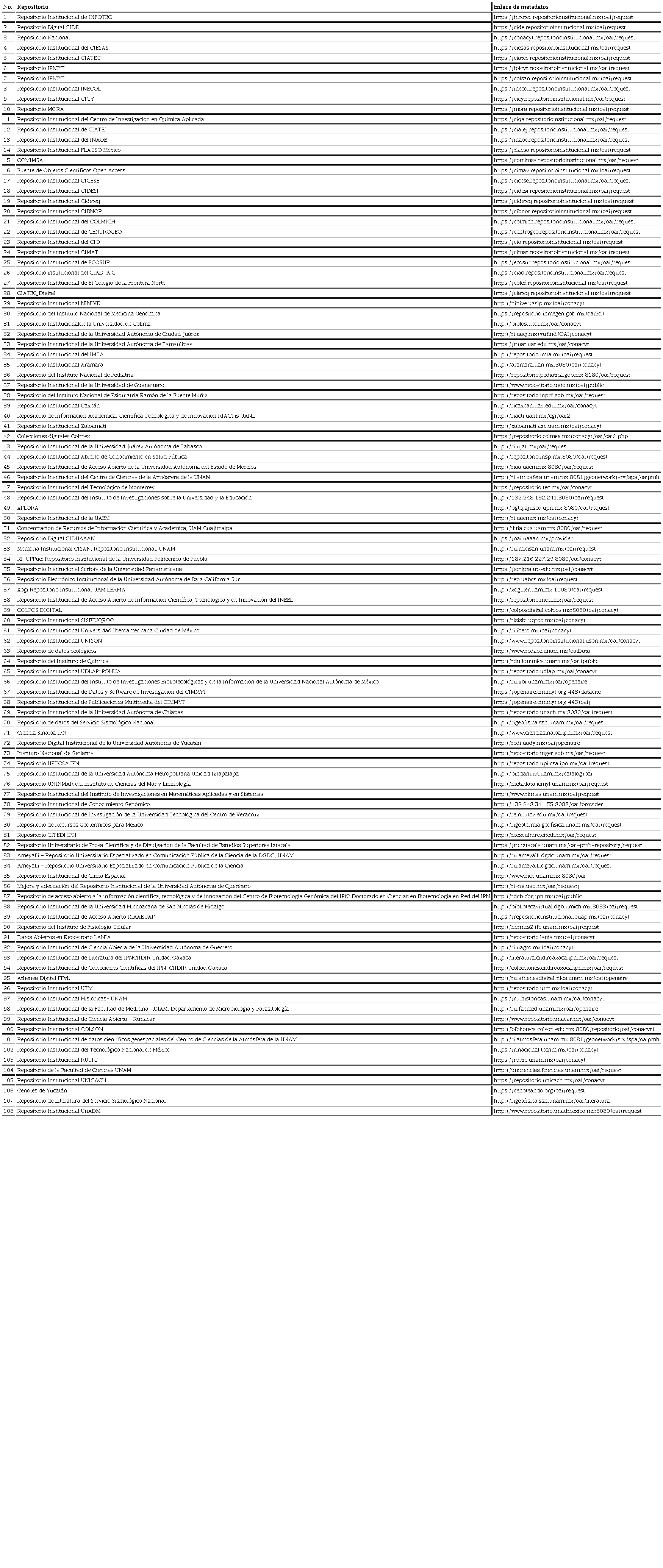 En cuanto a las iniciativas gubernamentales en México, el 20 de mayo de 2014 se publicó el decreto por el cual se modifica la Ley de Ciencia y Tecnología, que incluye el capítulo X “Del Acceso Abierto, acceso a la información científica, tecnológica y de innovación y del repositorio nacional” (Diario Oficial de la Federación [DOF], 2014: 29). Dicho decreto reconoce al Consejo Nacional de Ciencia y Tecnología (CONACyT) como el organismo encargado de la creación y operación del Repositorio Nacional, al cual se le define como “la plataforma digital centralizada que sigue estándares internacionales, almacena, mantiene y preserva la información científica, tecnológica y de innovación, la cual deriva de las investigaciones, productos educativos y académicos” (DOF, 2014: 29).