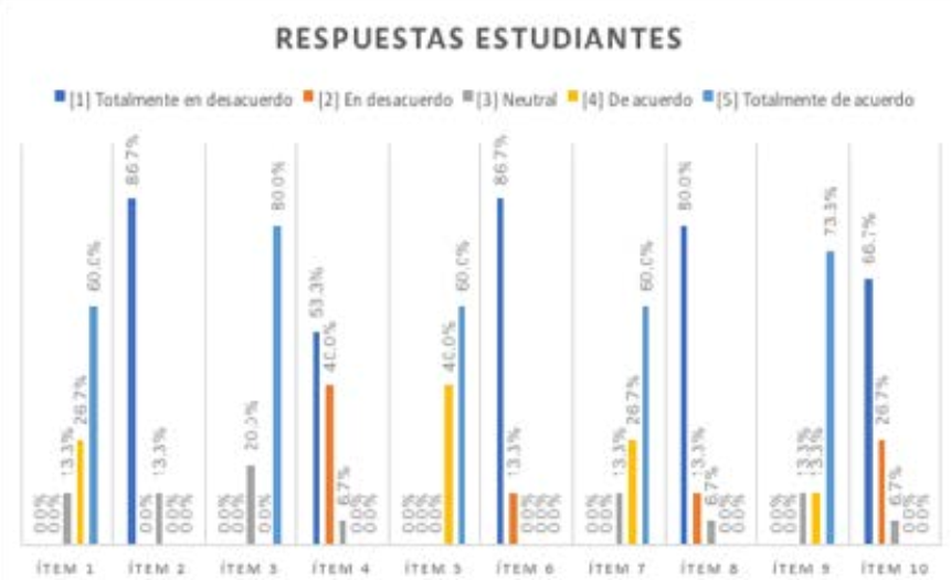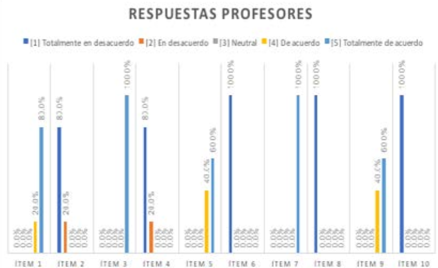 Asimismo, se muestran dos gráficas que representan el porcentaje para cada ítem de los elementos seleccionados por los usuarios del sistema; en la Figura 9 se presentan las respuestas de los estudiantes, mientras que en la Figura 10 se exhiben las respuestas de los profesores.