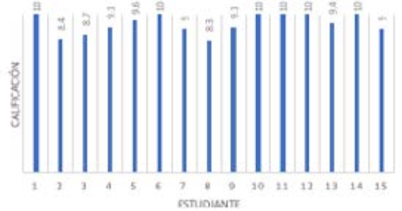 Finalmente, el profesor a cargo generó una evaluación cuantitativa, que fue realizada a partir de los aciertos obtenidos en cada una de las actividades y la participación durante las sesiones. Las calificaciones se establecieron en una escala del 0 al 10, donde: 20% obtuvo 10; 40% entre 9.0 y 9.9; y 40% de 8.0 a 8.9 (Figura 11).
