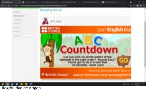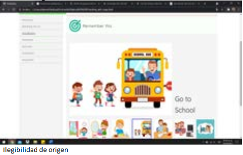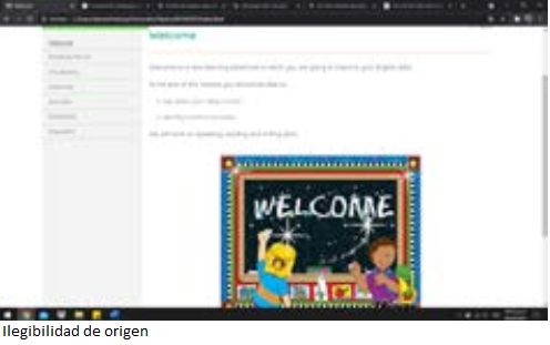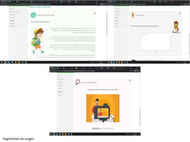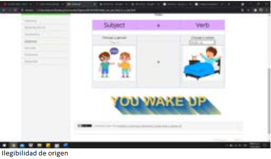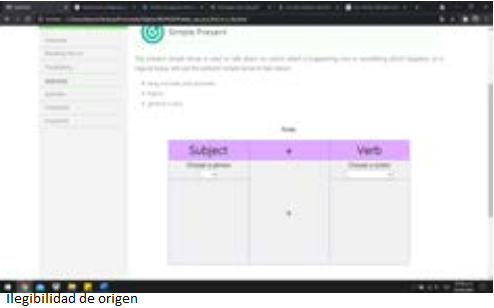 Posteriormente, se establece como metodología de enseñanza el Direct Method (método directo), en el que se expone al aprendiz a la segunda lengua de manera total. Este método se sustenta en el modelo de conocimientos previos de Ausubel, explicado por Santivañez (2004) en tres fases. En la primera, con recursos educativos, el docente presenta un tema y explica al estudiantado una primera actividad; en el REA se vislumbra como la presentación del vocabulario donde el alumno selecciona una imagen de un grupo para ser mostrada junto con su acción escrita (Figura 7). En la siguiente fase, el profesor guía a los discentes para realizar actividades; la secuencia en esta etapa es primordial para alcanzar un aprendizaje significativo, lo cual es establecido mediante la presentación de la gramática (véase la Figura 2); por último, el estudiante transfiere el aprendizaje a un producto propio, en el cual consolida el manejo del contenido y es representado por una lectura, un escrito y la realización de un video (Figura 8).