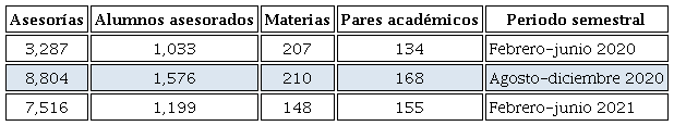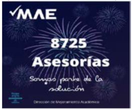 Adicional a lo anterior, se obtuvieron datos numéricos o numeralias sobre el número de asesores MAE y la cantidad de asesorías académicas ofrecidas en diferentes periodos académicos.