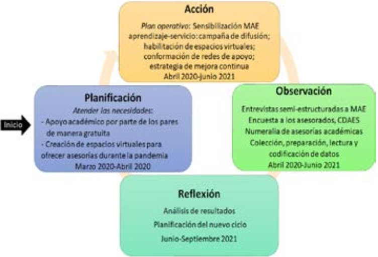 Durante la etapa de acción, se procedió a ejecutar la planificación establecida. Parte de la ejecución de la planificación consistió en aplicar el plan operativo, que radicó en sensibilizar a los MAEs respecto al aprendizaje-servicio. Esto implicó realizar campañas de difusión, habilitar espacios virtuales que favorecieran atender las necesidades identificadas. Como también, conformar redes de apoyo y llevar a cabo algunas estrategias de mejora continua con reuniones periódicas y encuestas.