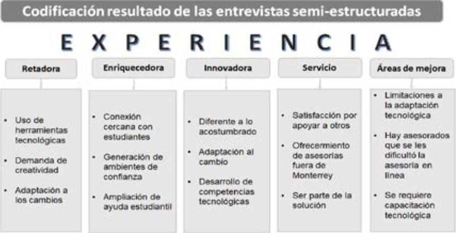 En la Figura 4 se muestra la codificación de las entrevistas semiestructuradas, realizadas por la coordinadora líder del programa. A partir de estos resultados surgen cuatro valoraciones de la experiencia de asesoría: retadora, enriquecedora, innovadora y con aportación al servicio. A continuación, se presentan algunos comentarios externados por los MAEs en relación con su experiencia como pares académicos. Los comentarios provienen de las sesiones de acompañamiento con la líder del programa, en donde se reforzaron las emociones y las relaciones positivas, el compromiso de ser parte de la solución y del cambio, y el propósito de vida a través del servicio (Peterson et al., 2007; Ye et al., 2020). Algunos comentarios fueron: