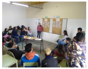 Durante el trabajo con los alumnos y docentes y en el espacio de debate (Fotografía 1), el interés no fue transmitir saberes sino construir colectivamente aprendizajes a partir del trabajo reflexivo sobre aquellas creencias que naturalizamos. Para esto, durante todo el encuentro permanecimos atentos a que el proceso de desnaturalización se produjera de forma andamiada y en coparticipación con los participantes, sin violentar la experiencia de desnaturalización, es decir, sin impartir saberes exógenos, científicos sobre los temas debatidos. De este modo, los debates oficiaron como “dispositivos de exploración y de aprendizaje colectivo” (Callon, Lascoumes, Barthe, 2001: 50).