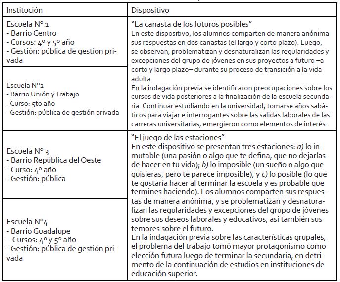 En este apartado presentamos los dispositivos construidos a partir de los datos relevados en la indagación previa, que constituyen el soporte didáctico-pedagógico de la práctica de extensión de educación experiencial. Por eso, este momento consiste en la implementación de dispositivos pedagógicos diseñados para fomentar la desnaturalización y el debate acerca de los cursos de vida de los jóvenes a través del trabajo colectivo junto a ellos. A continuación, en el Cuadro 2 detallamos algunos de los dispositivos desplegados durante la práctica realizada en las distintas instituciones.