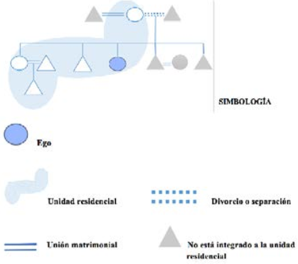 Para cerrar el análisis de esta trayectoria, tenemos a continuación la gráfica que corresponde a la estructura familiar de la que forma parte Mariana. Ella tiene cuatro hermanos, aunque dos (los mayores) ya no viven con su familia de origen, sólo permanecen Mariana y sus dos hermanos menores. En este núcleo residencial (sombreado en azul) se incluye también el sobrino recién nacido y podría incluirse también el padre de este niño, que, según ella, pasa la mayor parte del tiempo en esta casa familiar, aun sin establecer una cohabitación formal. Por otra parte, el padre vive en Guadalajara y su madre, que es reconocida como la jefa de familia y la principal proveedora del hogar, tiene como pareja a una persona que participa en la migración a Estados Unidos.