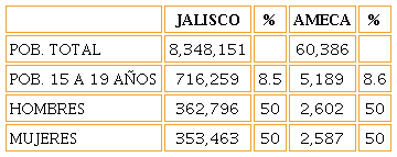 En la Tabla 2 observamos que tanto el estado de Jalisco como el municipio de Ameca presentan proporciones muy semejantes de la población de 15 a 19 años (rango en el que idealmente se llevan a cabo los estudios de educación media superior), estando en ambos casos por debajo de 9% respecto a la población total. Del mismo modo, observamos que la proporción de hombres-mujeres representa también tendencias idénticas entre la entidad federal y el municipio en cuestión, presentando la mitad de hombres y de mujeres en el rango de edad ya referido. Esta equidad estadística es interesante pues, no obstante tratarse de un municipio con altos grados de migración, como es el caso de Ameca, estas cifras nos permiten inferir que la movilidad poblacional no involucra de manera desigual a los hombres y mujeres en este rango de edad, de lo contrario, la migración cargada hacia un sexo o el otro se reflejaría (como ocurre con otras entidades mexicanas con gran movilidad) en grupos de población notablemente desequilibrados en función de los circuitos migratorios. Se puede inferir, con estricto apego a los datos presentados en esta tabla, que la migración no afecta de modo desigual a la población de este rango de edad que habita el municipio de Ameca. No obstante, estas apreciaciones deberían ser confirmadas o contrastadas con otras fuentes estadísticas relacionadas directamente con la migración.