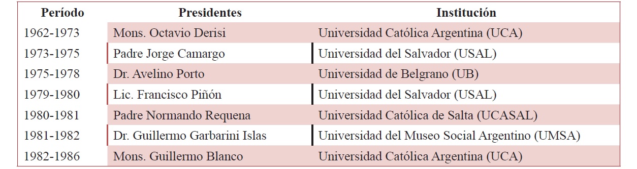 Asesorado por aquel el grupo de funcionarios católicos, el régimen de facto sancionó en 1967 la Ley 17.604 para las universidades privadas. Fue un nuevo intento por avanzar en los procesos de institucionalización y regulación del sector11. La nueva reglamentación alentaba la expansión institucional del sistema privado pero no eliminaba la sujeción que mantenía desde mediados de los años cincuenta frente al contralor del Estado. En su artículo Nº 1, la norma establecía: “La creación y funcionamiento de establecimientos universitarios privados requerirán el otorgamiento de la autorización pertinente por decreto del Poder Ejecutivo Nacional. Este ejercerá la fiscalización permanente del Estado sobre dichos establecimientos, con el objeto de verificar si se cumplen las condiciones bajo las cuales están autorizados a funcionar”.Pero si bien la normativa resultaba menos estricta (respecto a lo prefijado por la antigua Ley Domingorena) y las instituciones privadas podían obtener su reconocimiento definitivo –quedando facultadas a otorgar grados académicos y habilitación profesional–, se acentuaba una serie de exigencias burocráticas. Entre otras cosas, la norma establecía que estas casas de estudio debían constituirse sin fines de lucro, obteniendo personería jurídica como asociación civil o fundaciones. Por tanto, sus estatutos, programas y planes de estudio debían someterse a la autorización previa del Ministerio de Educación.Dicha Ley preveía, también, la puesta en funcionamiento del llamado Consejo de Rectores de Universidades Privadas (CRUP)12, como un órgano de coordinación en el ámbito de estas instituciones. Así lo establece en su artículo Nº 17: “El Consejo de Rectores de las Universidades Privadas será órgano de consulta en todo lo concerniente al régimen legal de la enseñanza universitaria privada, a la aplicación de éste y al planeamiento educativo en dicho sector”. En tanto órgano representativo del conjunto de las universidades privadas, es importante destacar el peso relativo que tuvieron las instituciones confesionales en su devenir durante los años de intervencionismo autoritario. Basta señalar cuales fueron los rectores de las universidades en cuestión que durante estos años desempeñaron el cargo jerárquico de Presidente del CRUP, para establecer significativas diferencias respecto a aquellos académicos que no detentaron otro cargo más que el de rector de sus propias instituciones.
