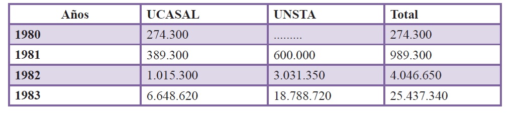 La contribución económica que recibió la UCASAL fue autorizada el 18/9/1979 mediante la Ley22.078 (reglamentada por resolución ministerial 842/80), pero comenzó a ejecutarse anualmente desde mayo de 1980. Sobre el destino de los fondos, el artículo N° 2 de la Ley determinó que debían ser aplicados exclusivamente al pago de sueldos docentes. En cuanto a la UNSTA, la situación reviste gran particularidad. El decreto 70 con fecha del 15/1/1981 (reglamentado por resolución ministerial 313/81) habilitó el otorgamiento de la contribución económica del Estado, puntualizando que “ello conviene al interés nacional”. Pero a diferencia de la Católica de Salta, el artículo 5º de esta norma eximió a la institución del cumplimiento de los artículos 28, 29, 30 y 31 del decreto 8.472/69 (que reglamentó la Ley 17.604), referidos a los proyectos de investigación o propuestas educativas que cada institución debía presentar al momento de solicitar un subsidio. Según Baruch Bertocchi (1987: 73), Aníbal Ernesto Fósbery, entonces rector de la UNSTA confesó ya en democracia que utilizó los subsidios para “comprar armas para los militares argentinos”.20