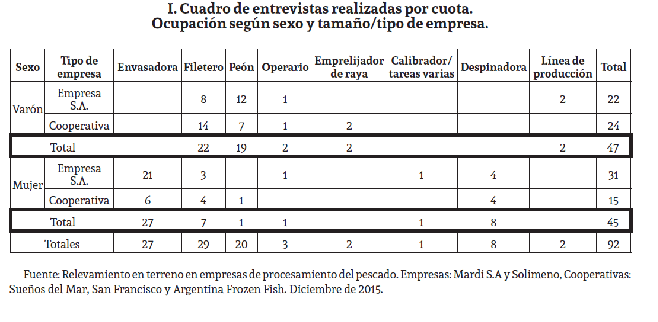 Las entrevistas fueron realizadas a un total de 92 trabajadores de la rama del filet, de las cuales 47 fueron realizadas a hombres y 45 a mujeres. A su vez, 53 de las entrevistas fueron realizadas en empresas formalizadas y 39 en cooperativas. En lo que refiere a las ocupaciones, 27 de los trabajadores/as entrevistados/as son envasadoras, 29 son fileteros/as (22 hombres y 7 mujeres), 20 son peones (19 hombres y una mujer), 8 son despinadoras, 3 son operarios (2 hombres y 1 mujer), 2 son emprelijaradores, 2 se ocupan de la línea de producción y 1 es calibradora.