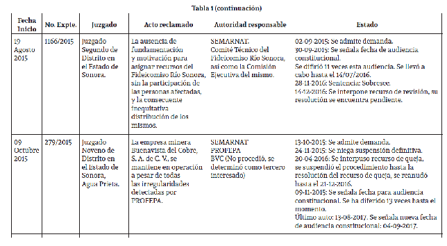 Los procedimientos que a continuación se analizan son los promovidos por los miembros de los Comités de Cuenca del Río Sonora. Los comités eligieron el juicio de amparo por considerar que los demás mecanismos son insuficientes, dado que los objetivos de tales procedimientos (civiles, penales, administrativos) versan sobre la aplicación de sanciones y el pago de indemnizaciones y no sobre cuestiones tendientes a la restauración, a la determinación de violaciones a derechos humanos y sobre todo, poco aportan para concretizar la garantía de no repetición. Al 31 de agosto de 2017 se encuentran vigentes 11 juicios de amparo, respecto a diversas temáticas; los primeros 8, se detallan en la tabla 1.