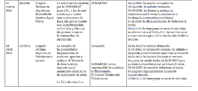 El 07 de abril de 2016 se admitió el juicio de amparo24 reclamando la autorización para que se construya y opere una nueva presa de jales en la ciudad de Cananea, donde la empresa BVC tiene sus instalaciones, respecto de la cual los habitantes de la comunidad vecina de Bacanuchi no tenían mayor conocimiento; de ahí que se reclama también la omisión por parte de la SEMARNAT de realizar la debida consulta pública que asegurase la participación de los afectados con dicha obra.
